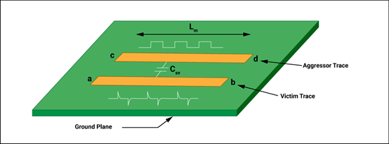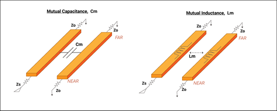 串?dāng)_是由一個(gè)PCB走線到另一條PCB走線的能量耦合引起的干擾,即使它們沒(méi)有接觸。它是由于電場(chǎng)(電容耦合)和磁場(chǎng)(電感耦合)的相互作用而發(fā)生的。磁場(chǎng)產(chǎn)生互感,電場(chǎng)產(chǎn)生附近走線間的互電容。互感負(fù)責(zé)在相鄰(受害)線上感應(yīng)電流,該電流與侵略者線上的電流相反。由于互電容而形成的電容器將在受害線上的兩個(gè)方向上通過(guò)電流。