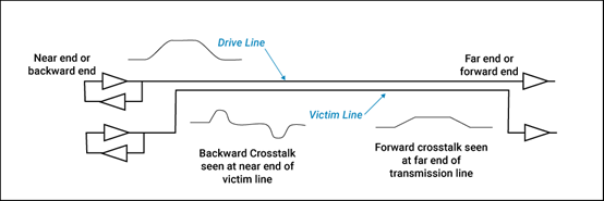 電感串?dāng)_有兩種類型:正向串?dāng)_和反向串?dāng)_。前向是在驅(qū)動(dòng)線路上距離驅(qū)動(dòng)器最遠(yuǎn)端觀察到的噪聲/干擾,而后向串?dāng)_是在受害線路上最近端觀察到的干擾。