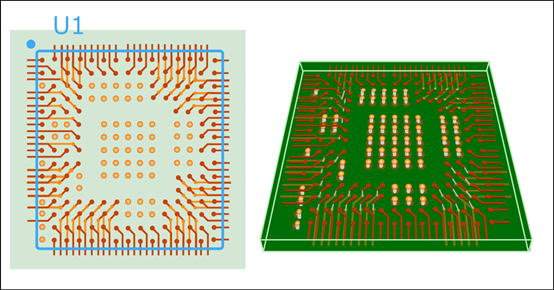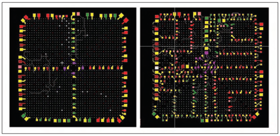 插圖顯示了放置盲孔以在 BGA 內(nèi)創(chuàng)建林蔭大道以改善突破。左:BGA 的傳統(tǒng) 4 象限扇出;右圖:添加了十字形盲孔,允許在內(nèi)層上創(chuàng)建的林蔭大道中增加 48 個(gè)逃逸通道,從而減少了突破器件所需的 4 個(gè)。
