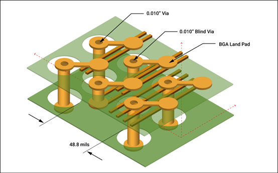 要在 0.8 毫米間距 BGA 上使用狗骨扇出,走線寬度必須為 10 密耳或更小,微孔必須更小(約 6 密耳)。對(duì)于更細(xì)間距的球柵陣列(0.5 毫米),使用填充和電鍍的焊盤內(nèi)微孔通過 7 mil 或 8 mil 走線布線到內(nèi)層中。這將在相鄰焊盤之間提供足夠的間距。