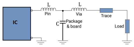 以通孔電感、電路板與焊盤之間的寄生電容以及引腳電感為主要部件的低通T濾波器電路。