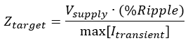 目標PDN阻抗會在整個信號帶寬內設置峰值阻抗值的上限。由于組件的電源電壓隨時間下降,因此允許的電源電壓紋波值也隨之降低。這些紋波值通常以百分比形式指定,您需要將該紋波百分比轉換為阻抗目標。可以使用以下公式計算: